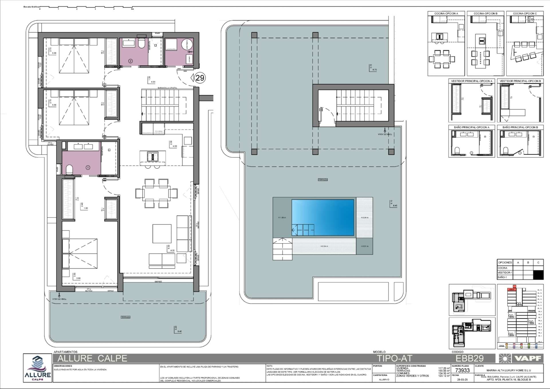 Furthermore, residents have access to the impressive communal areas of Allure: over 3,500 m² featuring an outdoor resort pool, a heated outdoor pool, a gym, a paddle tennis court, gardens, relaxation zones, and a pool bar where socialising is encouraged. The estate offers controlled access, parking spaces, and a private storage room.