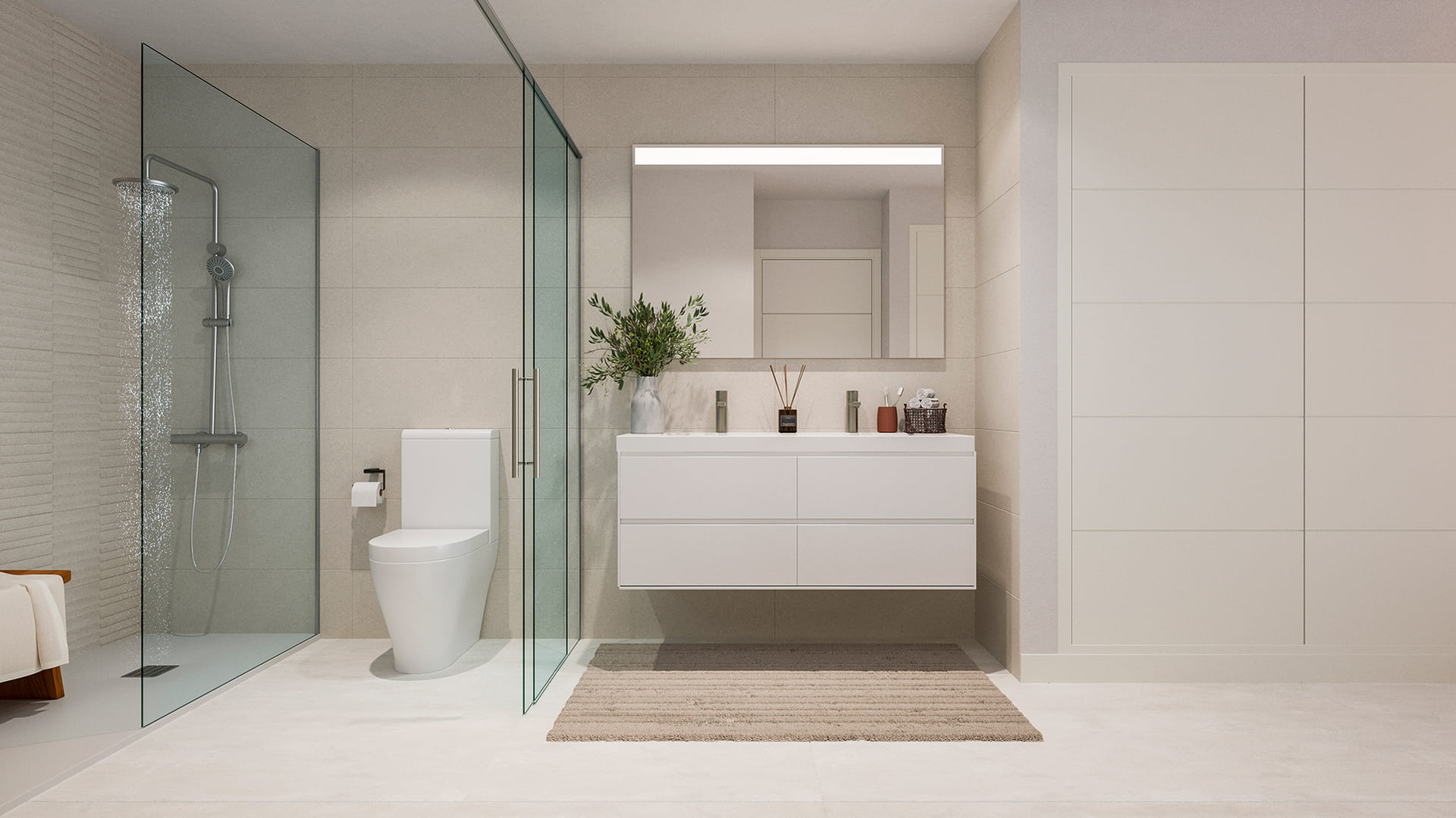 Each of the units is designed for those who value the combination of luxury and functionality. The interiors stand out for their spacious, carefully distributed rooms, optimising comfort and versatility. Large windows allow natural light to flood every space, while offering open sea views that connect with the Mediterranean surroundings. High-quality finishes, such as large-format porcelain floors, guarantee elegance, durability and easy maintenance, ideal for day-to-day living.