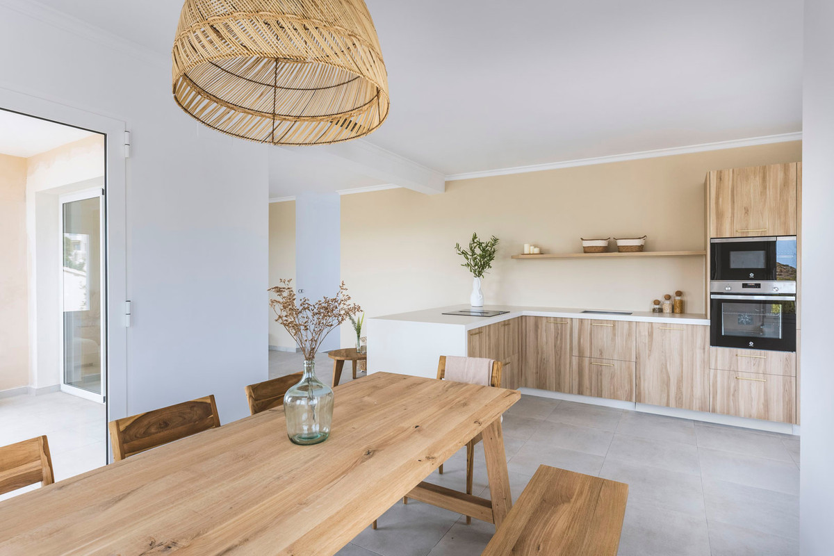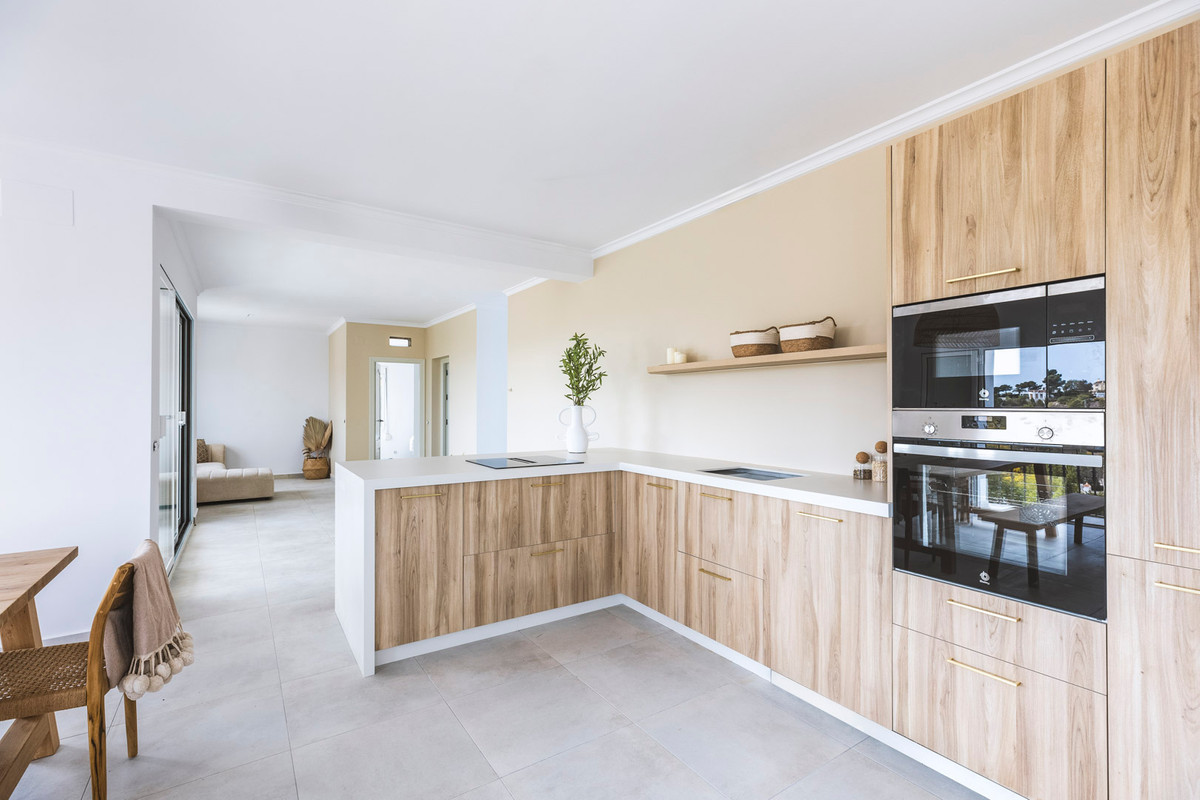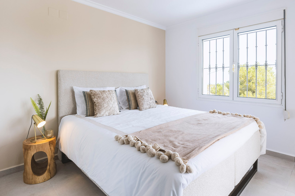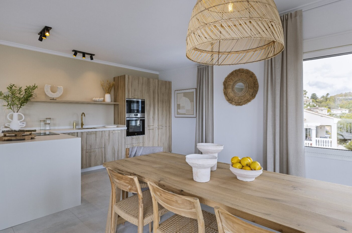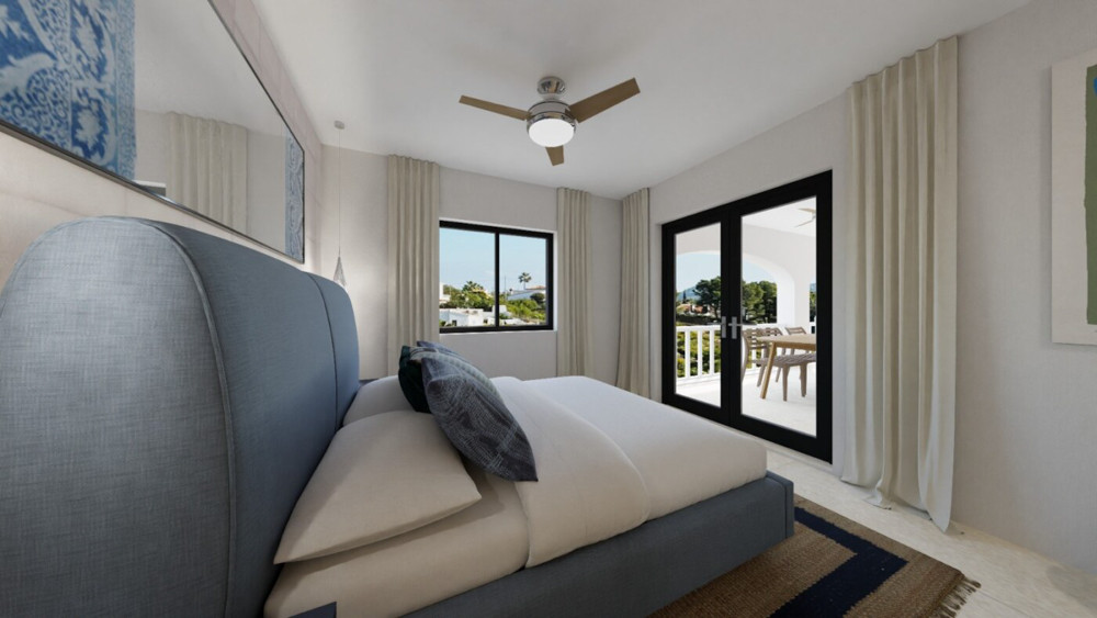 This villa is located in a quiet neighbourhood a very short distance from the beach, supermarket, schools, etc. There are views over Jávea bay from all the terraces. In total there are 4 bedrooms and 3 bathrooms spread over two floors. The first floor consists of a spacious living-dining room with an open kitchen and a double bedroom with an en suite bathroom. From the living room, there is access to a large partly covered terrace through large glass windows. The ground floor consists of a corridor in which there are two more double bedrooms and two bathrooms. At the end of the corridor is a third double bedroom with an en suite bathroom. There is also a large covered terrace on this floor. A few steps down is the swimming pool with sun terrace. The villa is air-conditioned and has a parking space down the street. The villa is currently being renovated and furnished. The furniture is not included in the price.